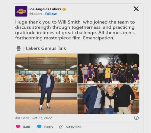 在文章中,Yaron Weitzman透露湖人大总管佩林卡时不时邀请各行各业的巨头来球队里分享和交流,有天邀请的嘉宾是威尔·史密斯。