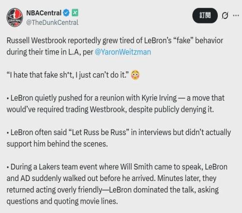 美媒《The Ringer》有个记者名叫Yaron Weitzman,他在今天撰文谈到了威少爷的事情,表示威少爷对詹姆斯在湖人的“虚伪”行为感到厌烦。